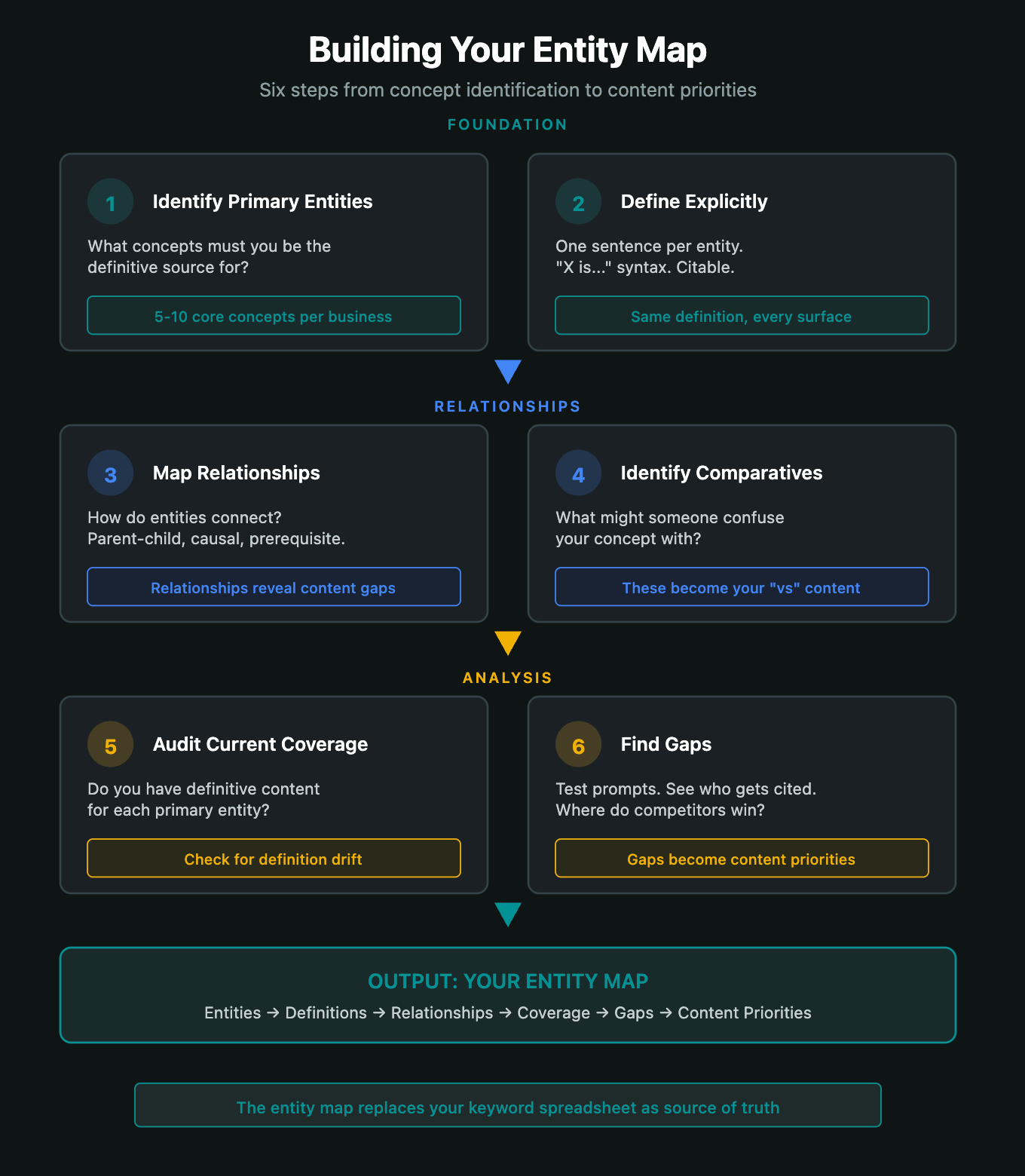 The entity map is your new planning artifact. It captures entities, definitions, relationships, coverage status, and gaps. It replaces or sits above your keyword spreadsheet.
