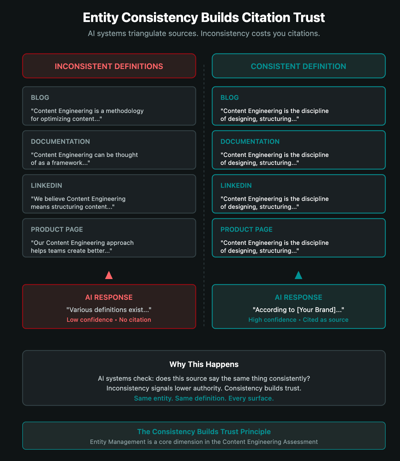 When AI systems encounter your content, they check: does this source say the same thing consistently? If your definition of Content Engineering varies between your blog, your docs, your LinkedIn posts, and your product pages, AI systems notice. Inconsistency reduces confidence in your authority.