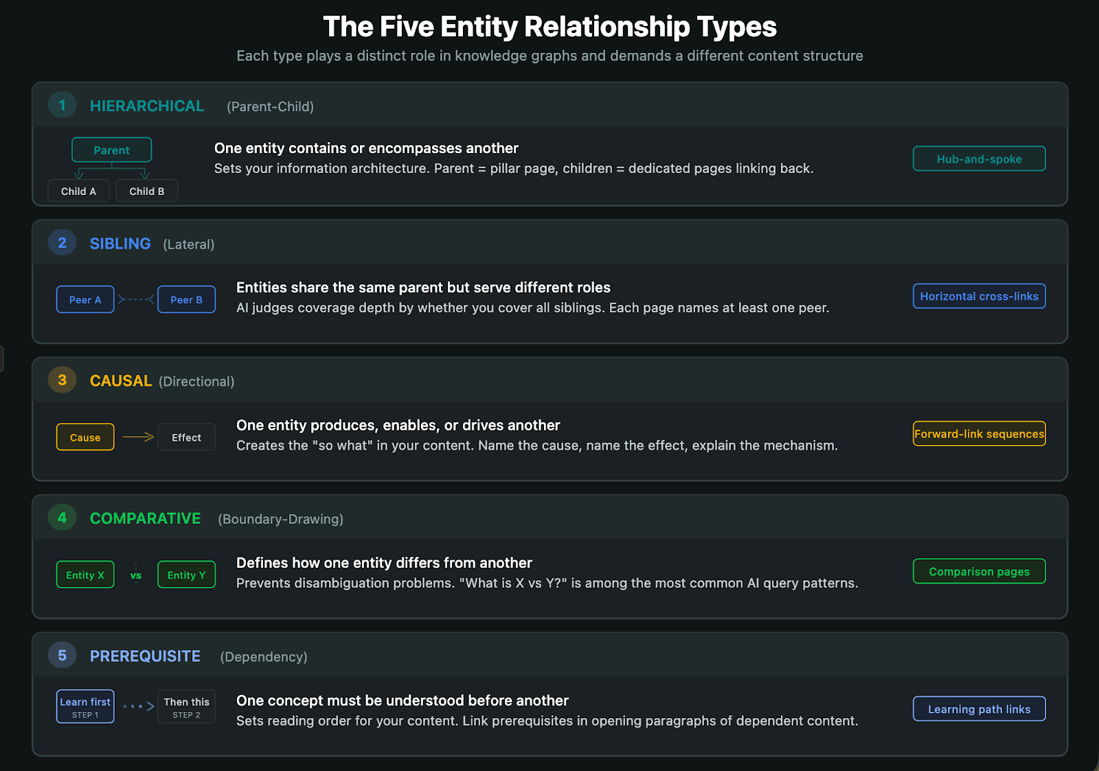 Five types drive visibility. Hierarchical, sibling, causal, comparative, and prerequisite relationships each play a distinct role in knowledge graphs. Each needs its own content format.